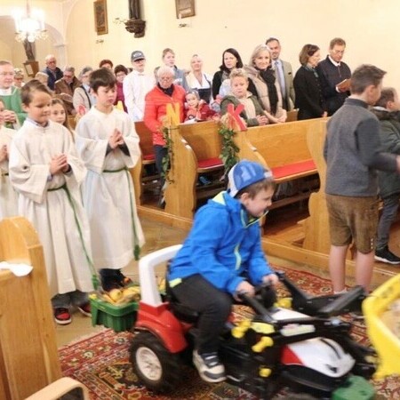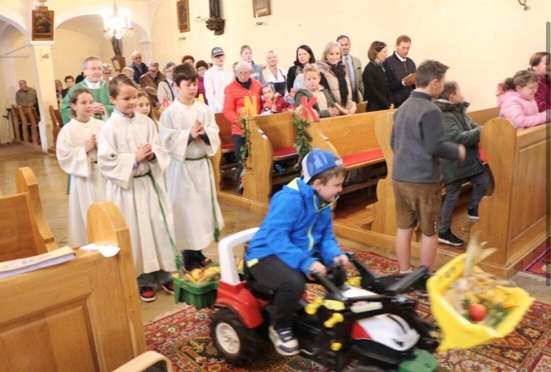 Mit Traktoren wurden die Gaben in einem feierlichen Einzug zum Altar gebracht, wo Mod. Christof Hinc diese segnete.