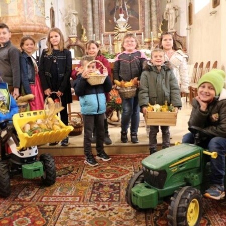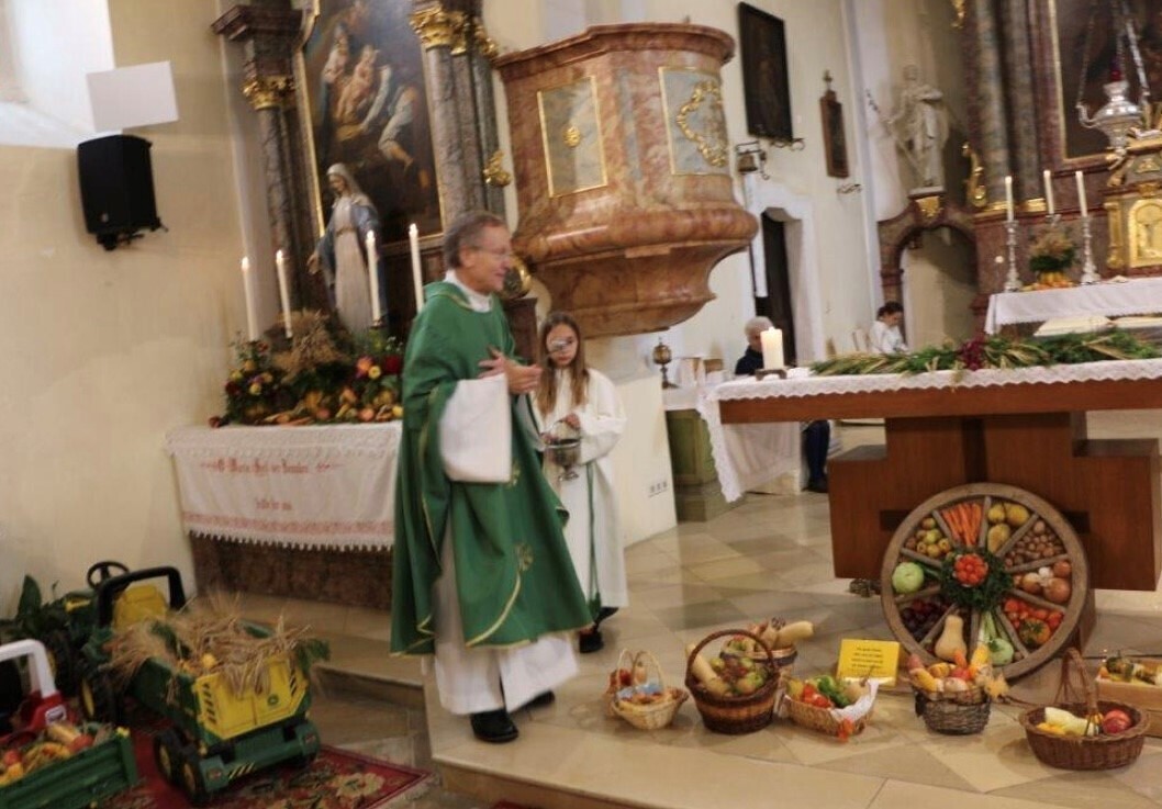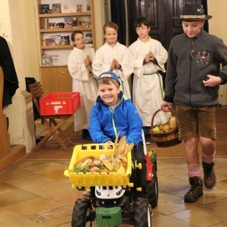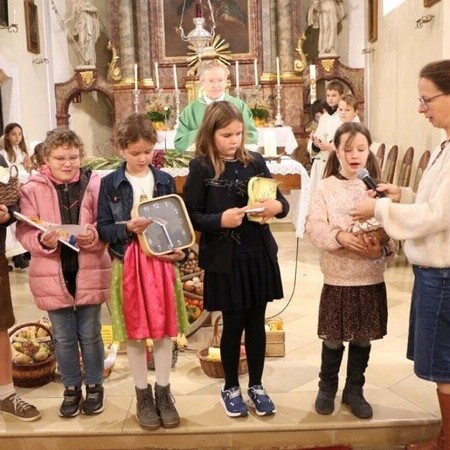 Die Kinder des Kindergarten und der Volksschule waren mit großer Begeisterung dabei und bereiteten zahlreiche Körbchen mit den Früchten von Garten und Acker für den Gottedienst vor. Sie brachten auch in den Fürbitten den Dank an den Herren dar.