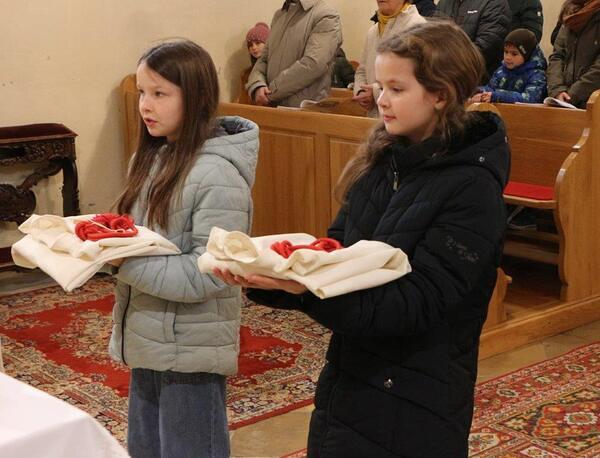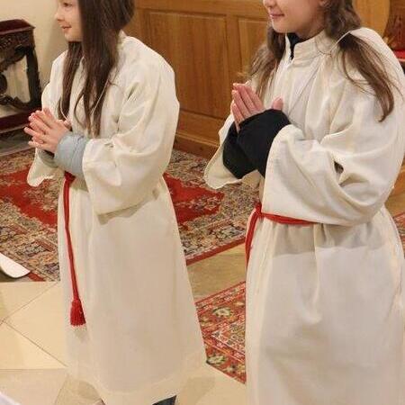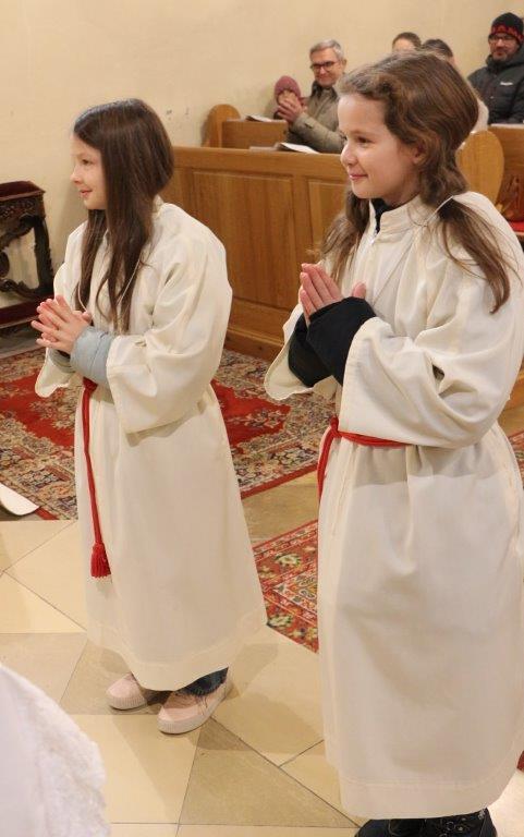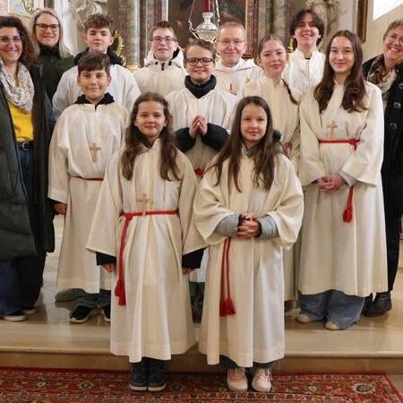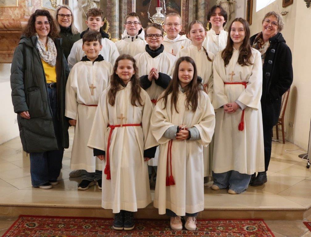 Als äußeres Zeichen erhielten sie die Kleidung der Ministranten – ein weißes Rochett, das Zingulum und das Kreuz – welche sie mithilfe des Herrn Pfarrers anzogen. Stolz vor Freude zeigten sie sich unter dem Applaus der zahlreich anwesenden Pfarrgemeinde.